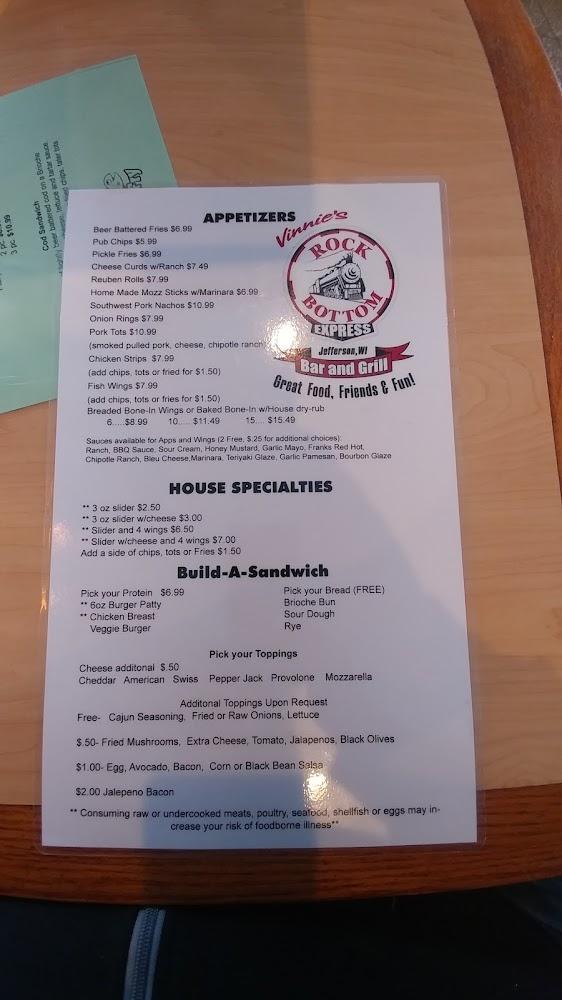 Rock Bottom Express offers a diverse menu that caters to varied tastes. The burger selection is impressive, with favorites like the Rock Burger and Baconator. For lighter options, the salads and wraps are refreshing choices. Enjoy classic starters like cheese curds or the pub's renowned fried pickles. Whether dining solo or with friends, options abound. The prices remain budget-friendly, averaging around $4 per dish. Each plate is crafted to satisfy and delight the palate. The local specialties add unique flavors to your dining experience.